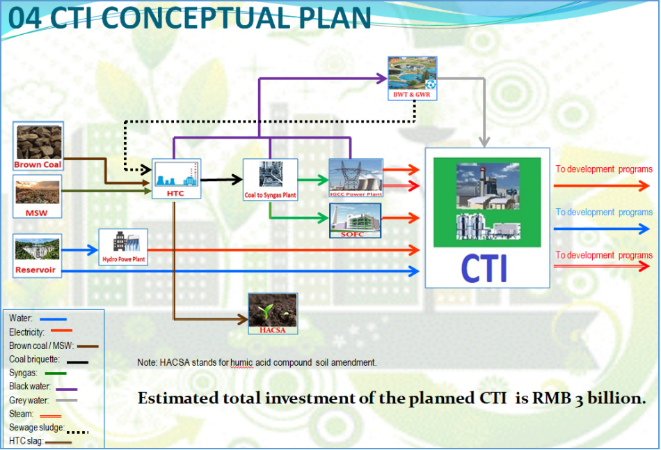 Bitung工業(yè)園清潔技術(shù)基礎(chǔ)設(shè)施平臺(tái)(CTI)計(jì)劃建設(shè)一套水熱碳化(HTC)裝置,每年可處理265萬(wàn)噸褐煤和城市生活垃圾,并生產(chǎn)106萬(wàn)噸水焦炭;一個(gè)合成氣裝置(利用水焦炭每年可生產(chǎn)26.8億立方米合成氣),可為IGCC發(fā)電廠、固體氧化物燃料電池(SOFC)系統(tǒng)和年產(chǎn)48萬(wàn)噸金紅石的生產(chǎn)線提供合成氣;IGCC發(fā)電廠,總裝機(jī)為270MW;SOFC混合發(fā)電系統(tǒng),總?cè)萘繛?MW;一座10MW的水電站和供水設(shè)施,可為Bitung工業(yè)園區(qū)一期提供285MW電力和4500萬(wàn)立方/年的供水。